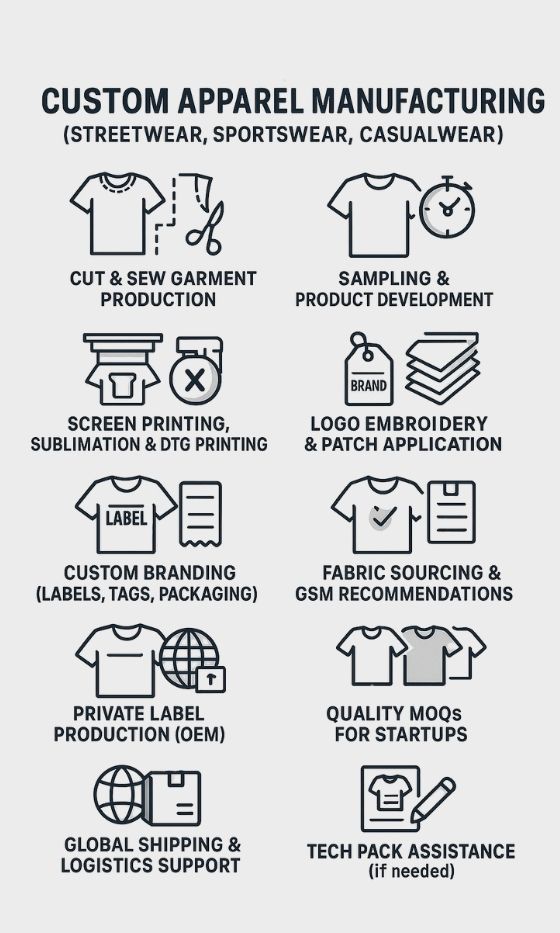 We add value by combining modern design execution with reliable manufacturing and strict quality control. Our focus is on consistent production, customization flexibility, and delivering street and everyday apparel that strengthens our clients’ brands at scale.